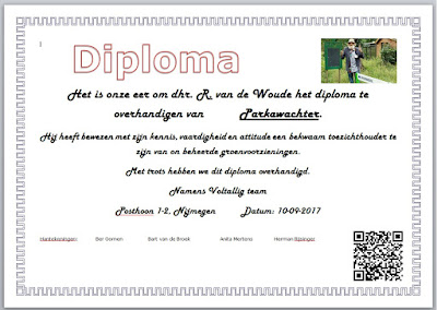 En ja hoor, ik heb weer een diploma er bij, gekregen van Ber. En dat heb ik ook verdiend. Met het wegvallen van beheer groenwerk moet er toch iemand zijn die het bij houdt, en dat doe ik.